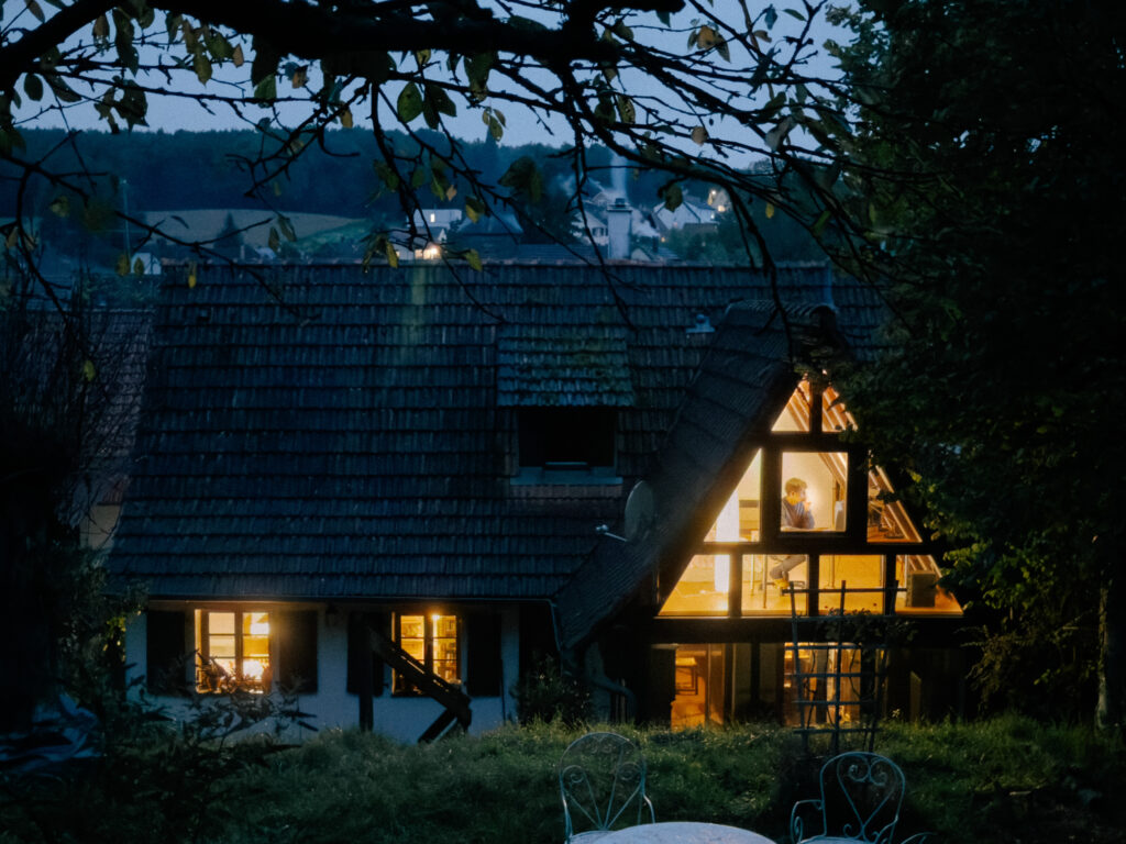 The house stands in an Alsatian village. Through thin walls and wooden floorboards, every sound passes: woodpeckers, air traffic, church bells down in the village, the hum in the electrical cabinet, wood pigeons on the TV antenna.